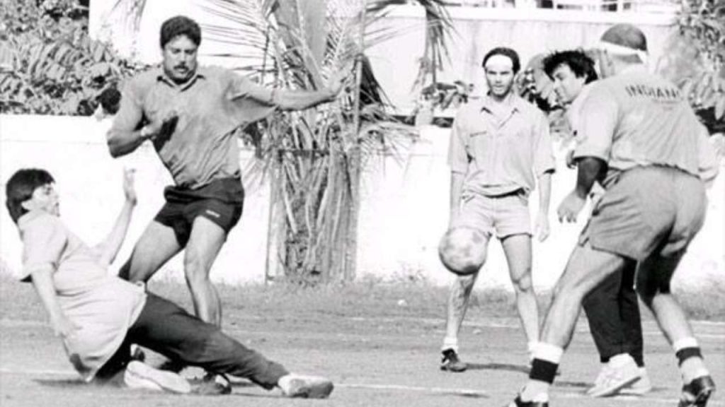 Recently a photo Shahrukh Khan and Kapil Dev is making rounds on the cyber space. It is an old picture in which Shahrukh and Kapil can be seen together in one frame playing football. The photo dates back to 90’s when film stars and cricketers played together for charity work. Those were the times when leagues were not created and the film stars and cricketers played friendly match with each other. And we have got got our hands on one of the vintage pic of them, which is a treat for the fans of Kapil and Bollywood Badshah Shahrukh.
