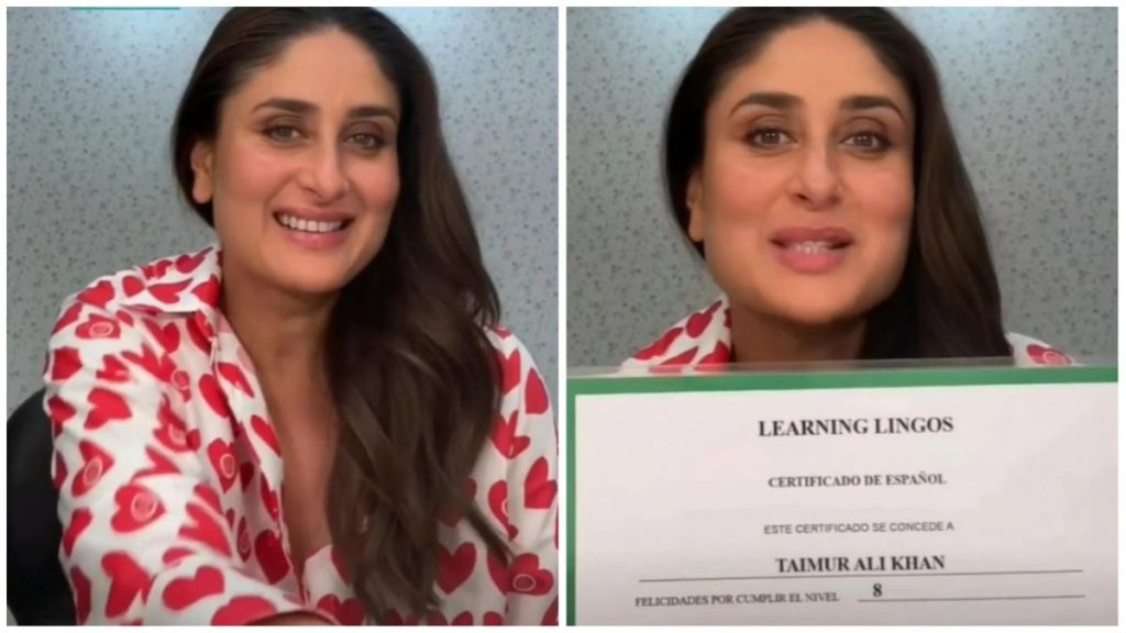Kareena Kapoor is back in Mumbai after a long family vacation in the UK. The actress, on Tuesday, posted a video to speak about her elder son Taimur Ali Khan learning Spanish and making her proud. She likewise showed his certificate that said he has cleared level 8 of his Spanish class.