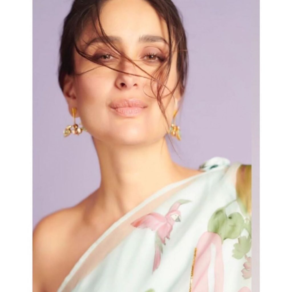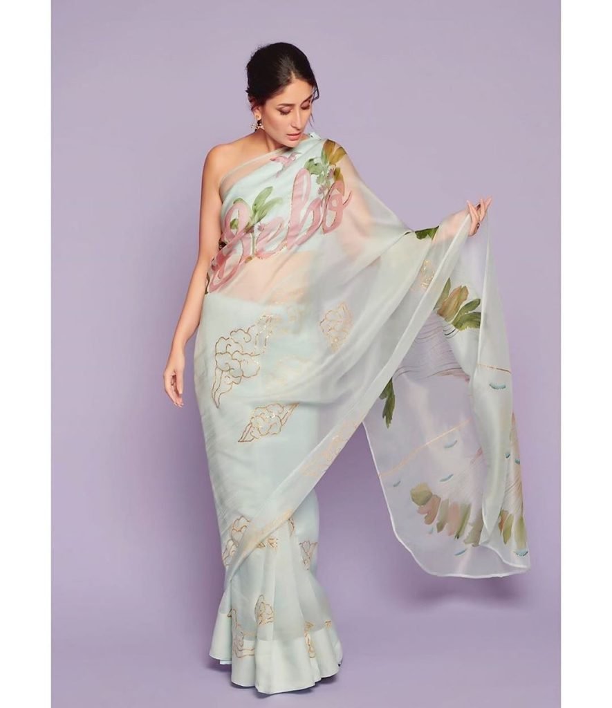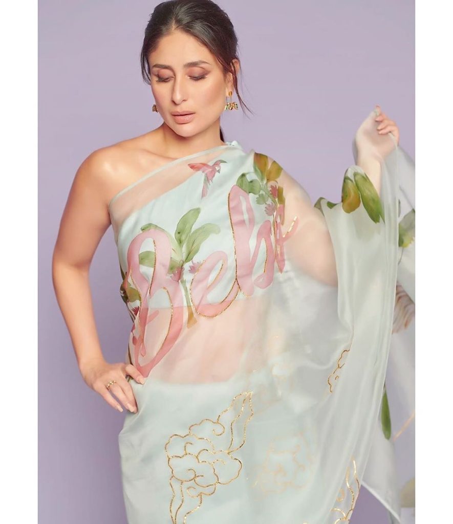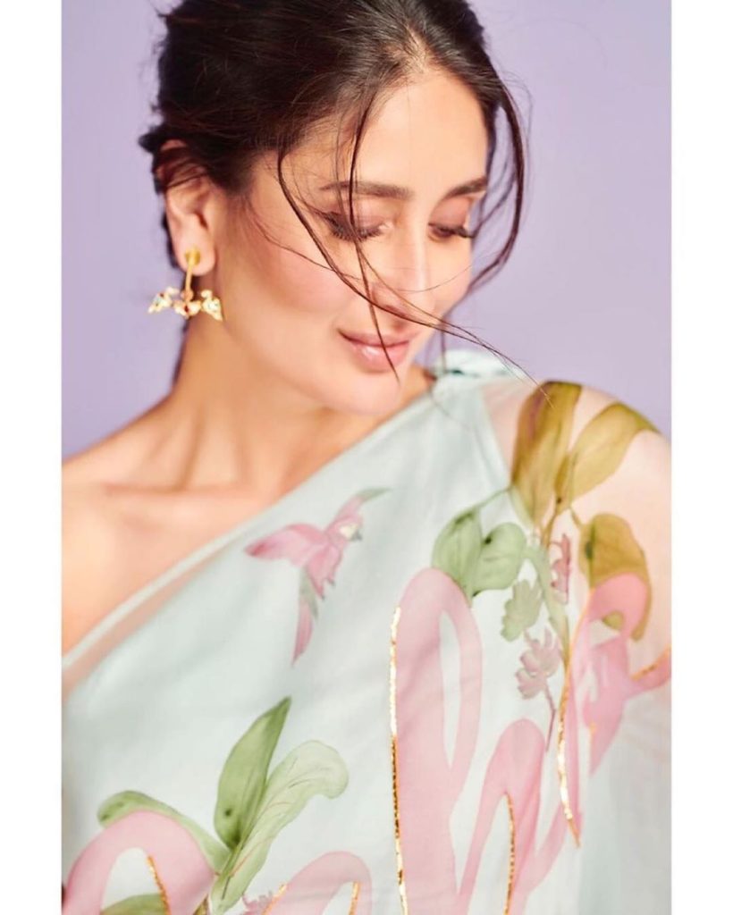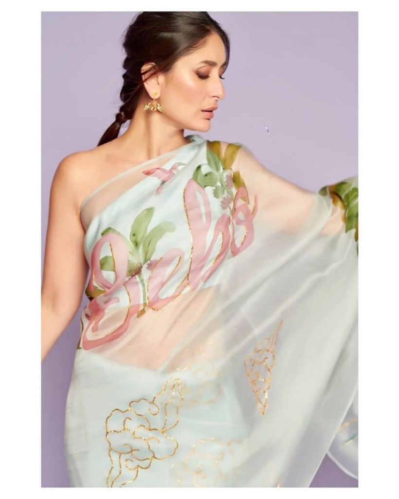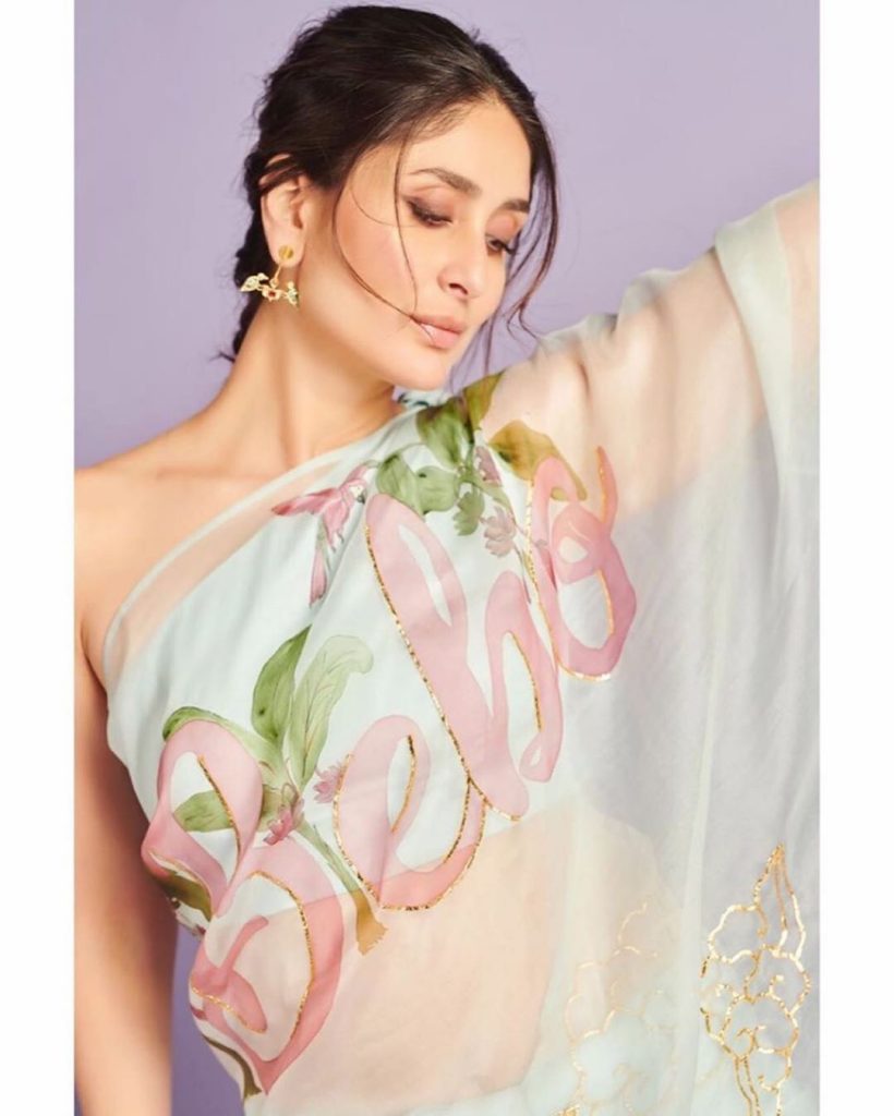 She carries herself beautifully in any attire she wears. Kareena looks more beautiful, especially in sarees. Recently, the actress has posted some pictures on her Instagram, in which she is seen in a sari. Kareena looks quite sexy in those pictures. The actress is wearing a white color organza pastel shade saree which was filled with intricate floral print with which she is wearing an off-shoulder blouse. Another special thing in this saree of Kareena is that her name is written on it with a pink color. With her hair styled in a simple braid and statement earrings accessorized with the sari is completing her look. Minimalistic makeup with light smoky eyes and nude lip color is making her look quite elegant. The saree is designed by Picchika. Her recent saree look will inspire you to give creative twists to your wardrobe: