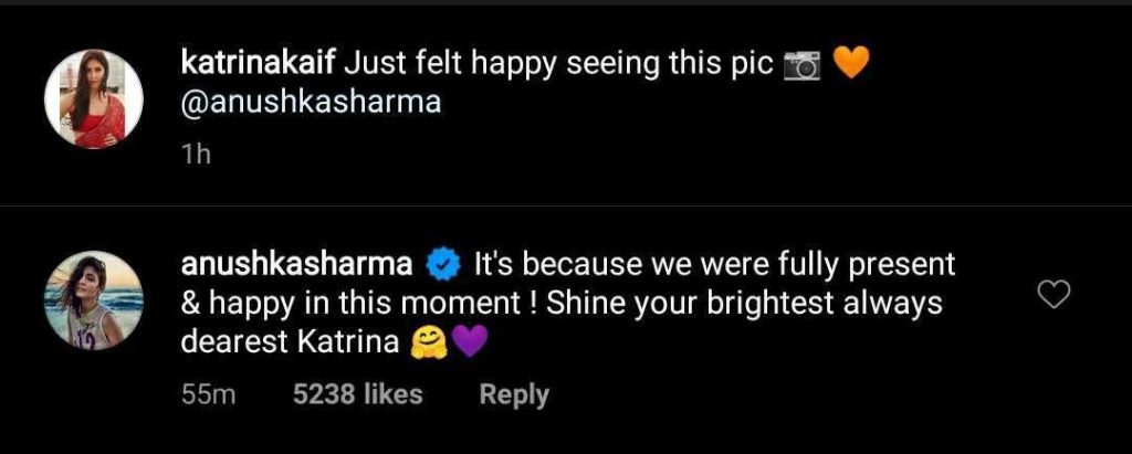 On this adorable post of Katrina, Anushka Sharma too reacted to this picture by commenting on her post that read “It’s because we were fully present and happy at this moment! Shine your brightest always dearest Katrina.”