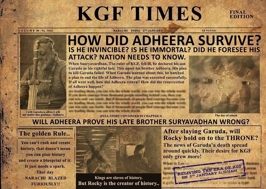 It seems like Sanjay Dutt is all ready to entertain the audience once again. As his most awaited film whose preparations were going on for two years will hit the screen soon. The film is titled KGF: Chapter 2. And now the makers have dropped the poster of the same. The makers today dropped all the details about the film and also shared a glimpse of the most awaited film. The makers will be unveiling the teaser of the movie on January 8, 2021, at 10:18 am on the YouTube channel. They also shared a picture of an old newspaper that carries the news of Adheera’s survival.