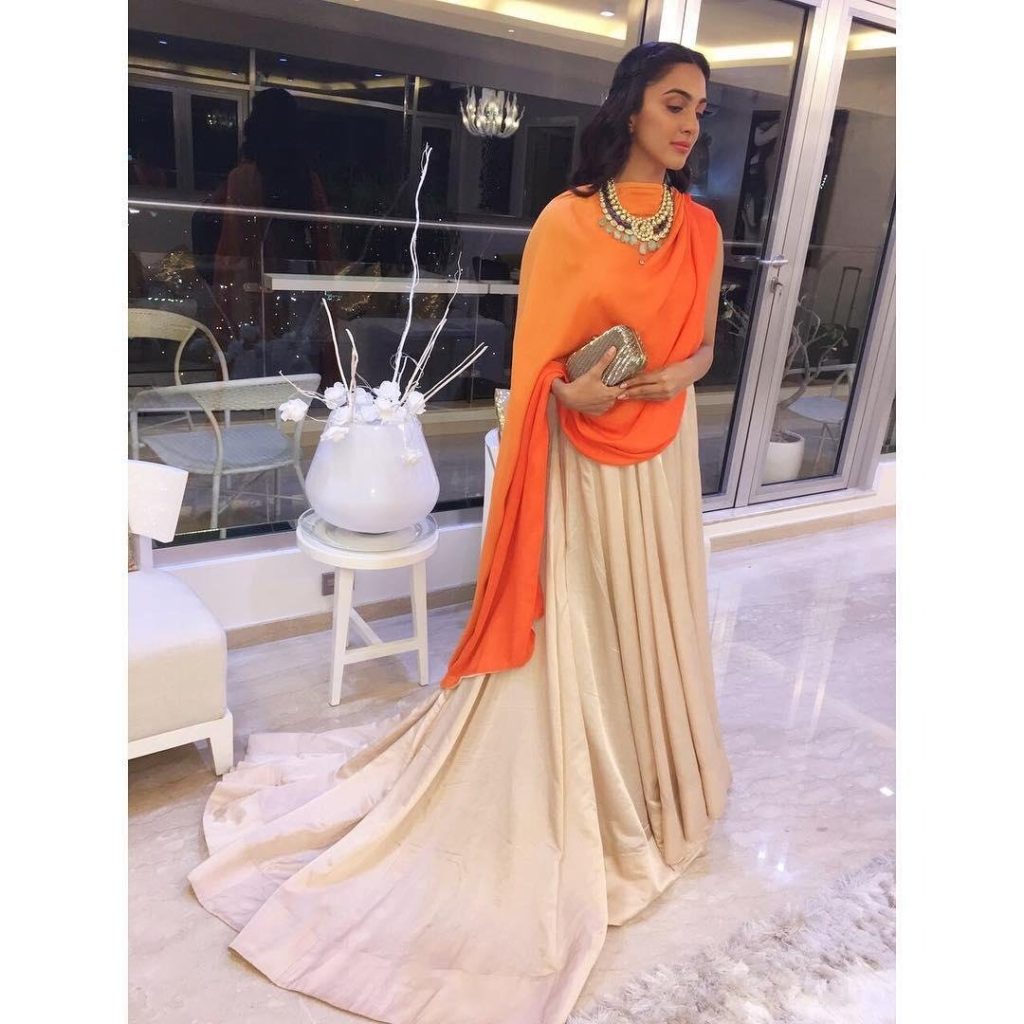 The actress looked amazing when she posed herself in an ethenic orange and beige outfit. In her living space.