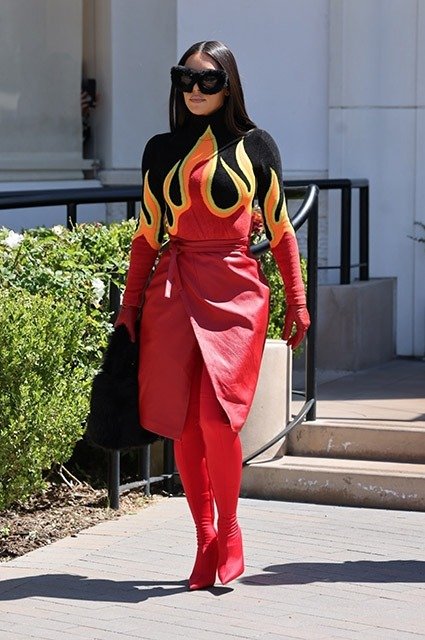 The day before the premiere of the new family reality show, Kim Kardashian, along with her sisters Kourtney and Khloe, was spotted having lunch at the Fornaio Italian restaurant in Woodland Hills, California. It would be difficult for even the most inattentive paparazzi to lose sight of the celebrity – Kim appeared in public in a “flaming” outfit: a bright red skirt and a turtleneck with flames. Balenciaga’s soft faux-fur accessories, bag, and fluffy sunglasses completed the look.