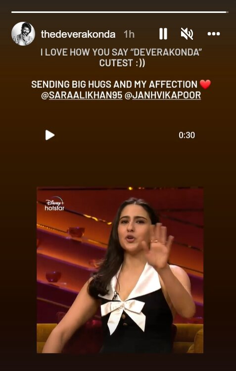 Vijay, on Tuesday, reacted to Sara’s comment on his Instagram Stories. Sharing the promo, he penned, “I love how you say ‘Deverakonda’. Cutest. Sending big hugs and my affection (heart emoji).”