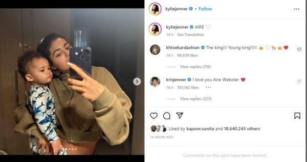 Celebrities and close family members shared their excitement on the post in which Kylie shared heartwarming photos with Aire. Kris Jenner said, “I love you Aire Webster.” Hailey Beiber posted crying emoticons and called Aire an ‘angel.’ Khloe Kardashian wrote, “The king!!! Young king!!!!! “