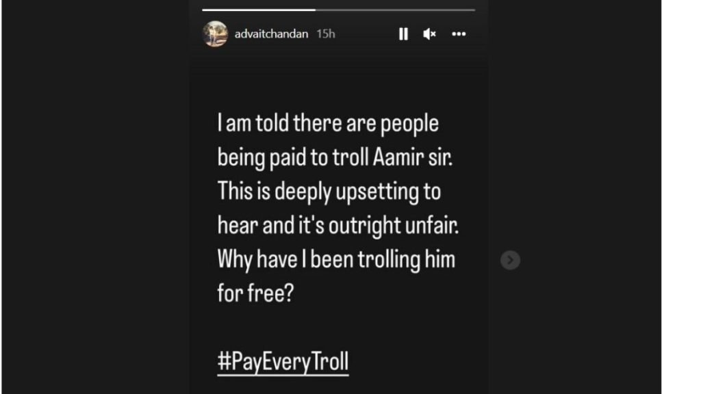 On Monday, the director took to his Instagram Stories and seemed to take a jibe at Kangana Ranaut, and others, who said trolls were hired to make a buzz around Laal Singh Chaddha. “I am told there are people being paid to troll Aamir Sir. This is deeply upsetting to hear and it’s outright unfair. Why have I been trolling him for free?” Advait wrote as he shared the hashtag ‘Pay Every Troll’.