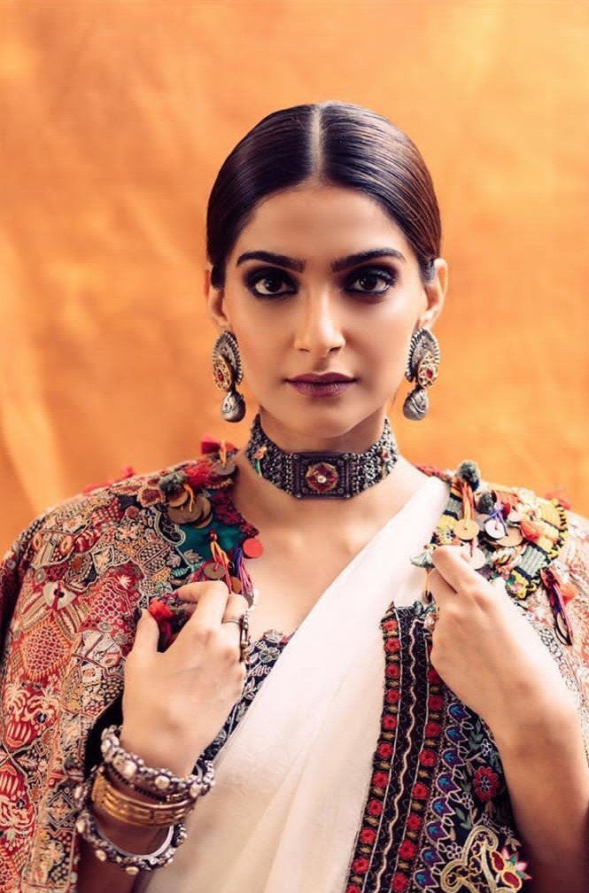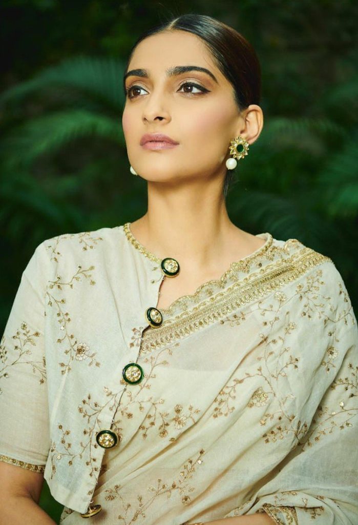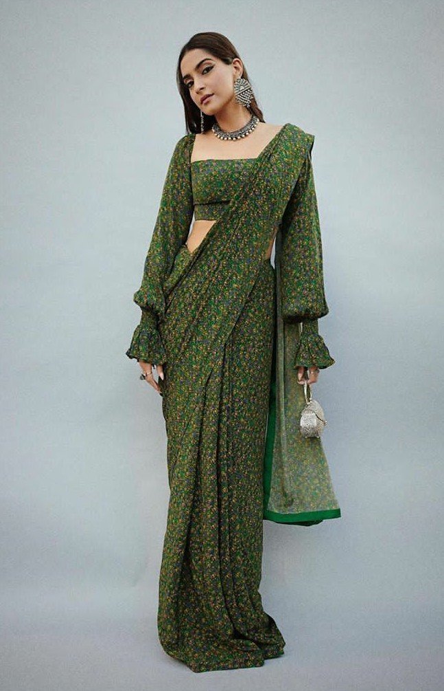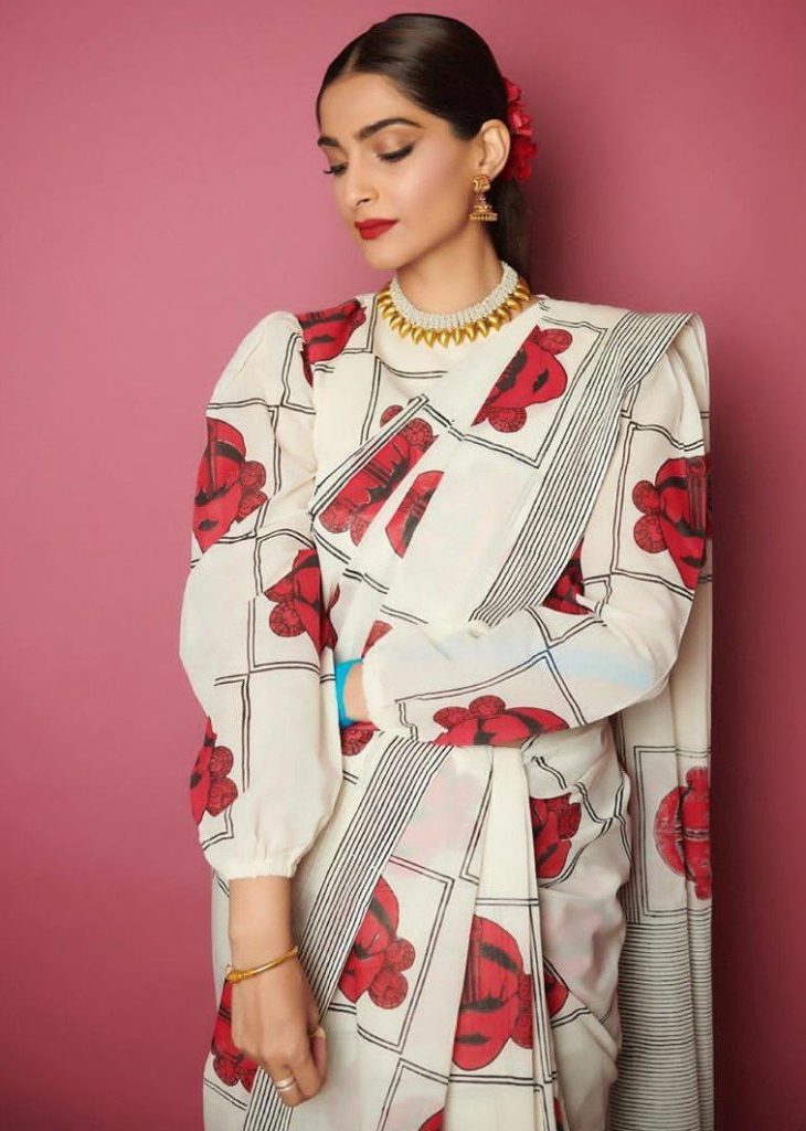 We might have seen such printed sarees in abundance. Such patterns have been really very old but have we ever thought of wearing such sarees with a twist? No! Sonam here makes the old sarees look extremely modern by wearing a super hot blouse. The arm style of the blouse deserves a thumbs up! Moreover, teaming up silver jewellery with it is a sane decision.