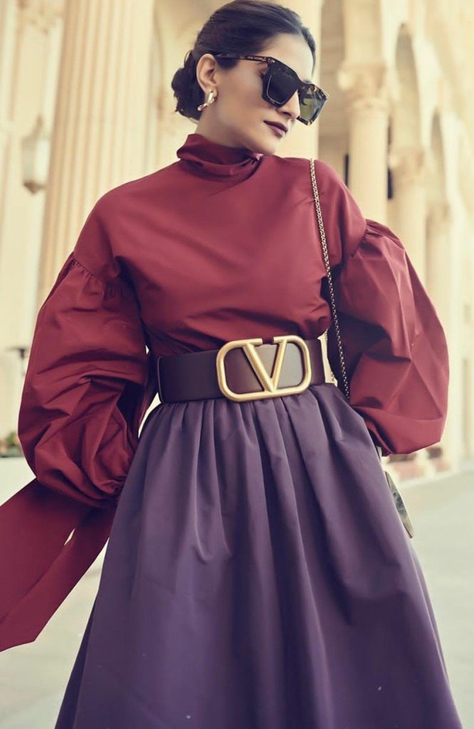 Burgundy and Violet must have not gone so well before! We can also go for this color combination. Another highlight of the dress is the pattern of sleeves. Moreover, the belt in the middle completes the look.