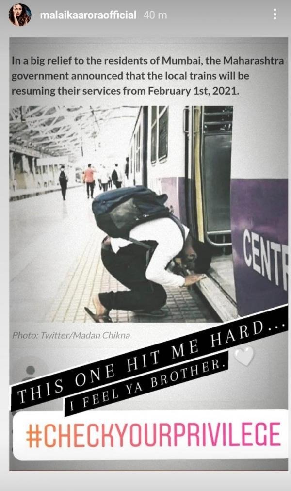 The photo posted by Malaika and Arjun is of a man who can be clearly seen worshipping the local train in Mumbai before getting in. For those unversed, the Mumbai local train services started resuming from February 1st and this photo was taken by Saambaa Shachin Vaidya who was stuck in a chord with Arjun and Malaika.