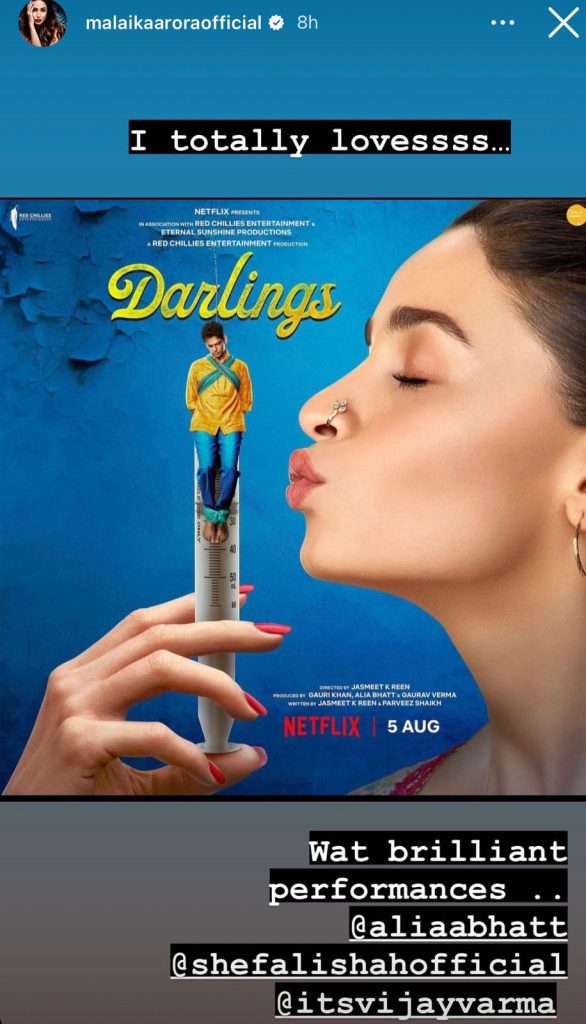 Alia Bhatt’s film Darlings dropped on Netflix on August 5. The dark comedy likewise features Vijay Varma, Shefali Shah and Roshan Mathew, and is backed by Shah Rukh Khan’s Red Chillies Entertainment. On Tuesday, Malaika Arora took to her Instagram Stories and gave the film its ‘brilliant’ cast a shoutout as she declared her love for the movie.