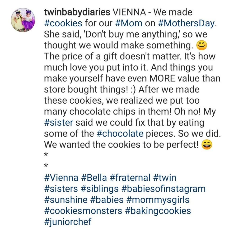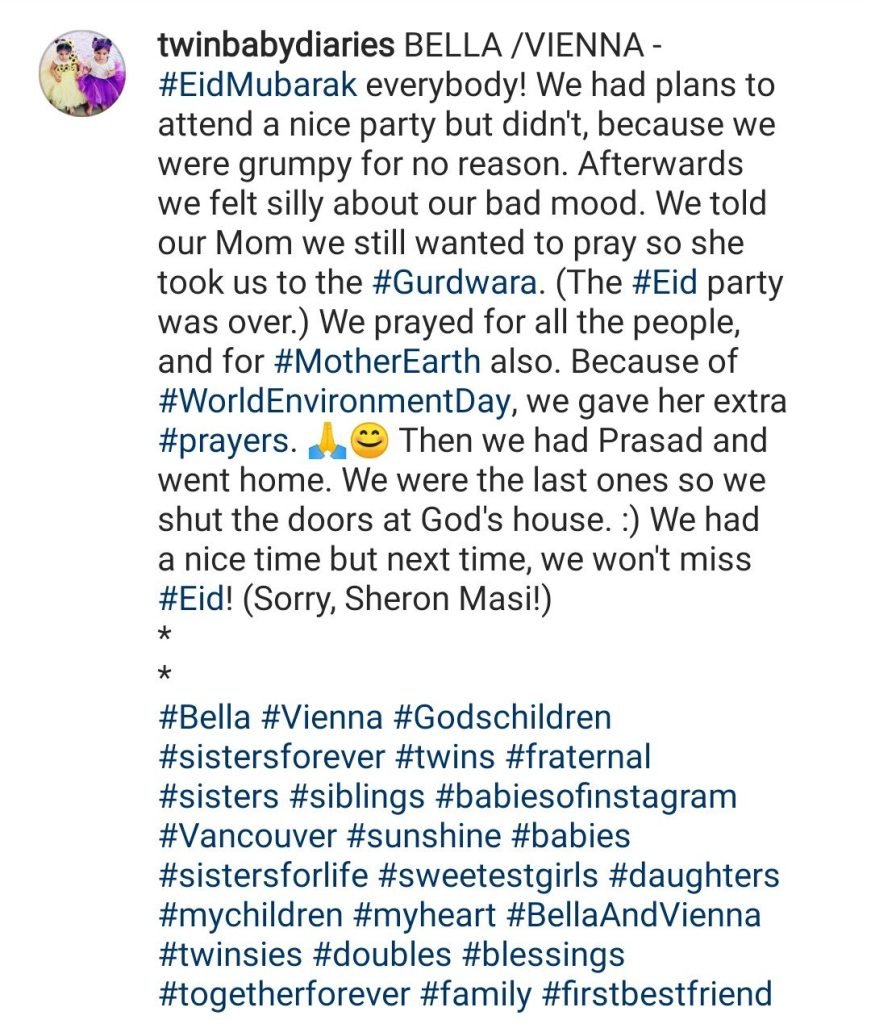With the name of ‘twinbabydiaries’, their page has become extremely popular. What makes the page different from all other pages is that it is regularly updated and adorable stuff is posted by the mother Teejay Sidhu herself. She is never up for missing even a single cute moment and uploads it over the page followed by an amazing caption. The captions usually show conversation between Bella and Vienna which is decoded by mom Sidhu.