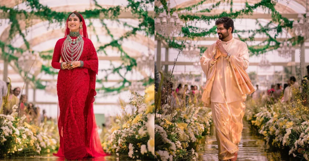 For the ceremony, Nayanthara wore a red outfit with heavy jewellery in green stones and diamonds. She tied her hair in a bun and decorated it with flowers. Vignesh wore a beige outfit. Both their dresses were from Jade by Monica.