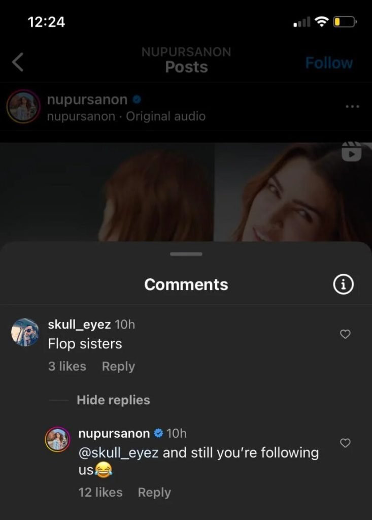 While many people sent their condolences to the actor, a user on Instagram wrote: “Flop sisters.” In reply, Nupur wrote back, “And still you’re following us.” Her reply has made it to Reddit.
