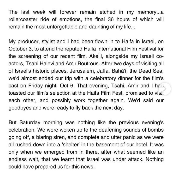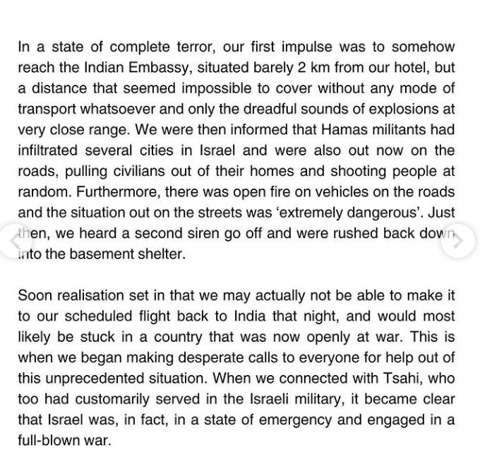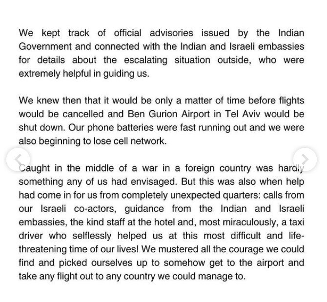 She continued by thanking the Indian government, the Israeli and Indian embassies, and everyone who had prayed for her safety. She also hoped that Israel will soon experience peace again. Nushrrat went into further detail about her experiences in Israel in a lengthy statement that was also published on her Instagram account.