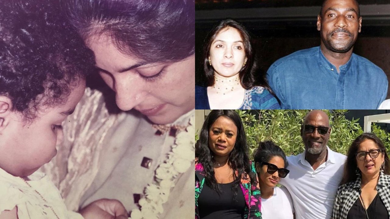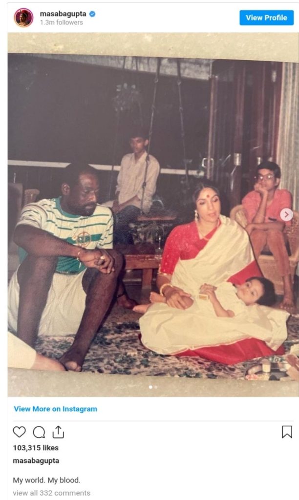 Masaba Gupta is the daughter of actress Nina Gupta and former West Indies great cricketer Vivian Richards. In the pictures Masaba has shared, she is very small. It is seen in the picture that Masaba is lying on her mother’s lap. Neena is wearing a nice white and red color sari. Her father Vivian Richards is also sitting next to her. Vivian is seen in a casual t-shirt and shorts.