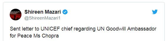 Pakistan’s Minister for Human Rights Shireen Mazari has penned a letter to the United Nations Children’s Fund (UNICEF) Executive over the removal of Bollywood actor Priyanka Chopra as its Goodwill Ambassador. Here’s the letter:
