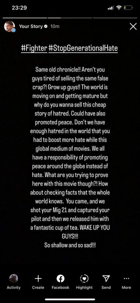 She posted on her IG story, “So sad and unfortunate to know that there are artists out there in this day and age who are aware of the power that the cinema holds and still go ahead and feed the riff between the two countries. I feel sorry for the artists who try to bridge the gap by trusting their art as a medium.”