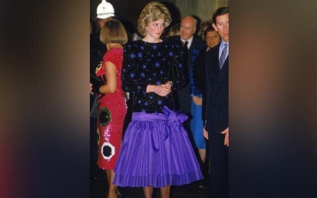 Diana debuted the designer Jacques Azagury’s black and blue ballerina-length evening gown in Florence in 1985. According to the auction site, she was also pictured wearing it during a trip to Vancouver a year later.