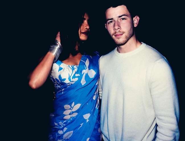 Wearing the saree, she is giving an example of a perfect global desi girl. She has also posted pictures of her with husband Nick Jonas. In the pictures, she is wearing blue and white floral print saree. She completed her look by pairing it with the set of silver bangles and maroon lipstick.