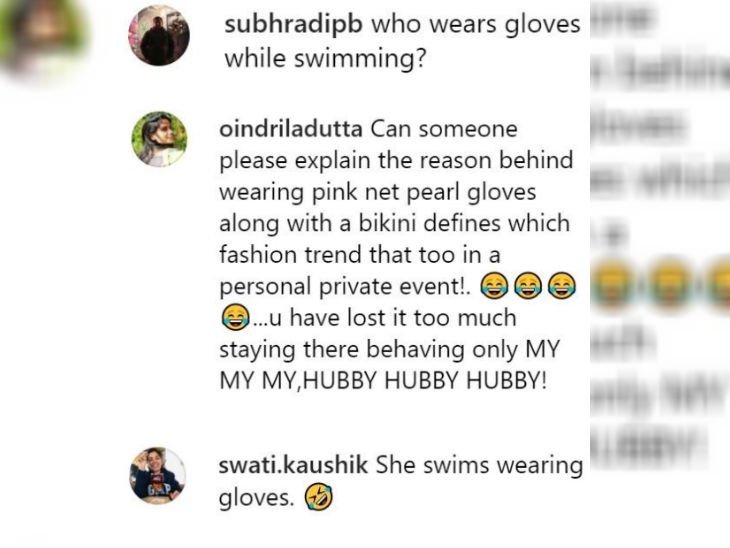 Her fans are keen to know what made her wearing gloves during swimming. A user commented on her photo, ‘Who wear gloves in the hands during swimming?’. Another user wrote, ‘can someone explain to me that where the fashion of wearing gloves with swimsuit exists? That too at the private space. You have lost so much in your husband that you have forgotten everything.’