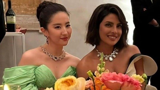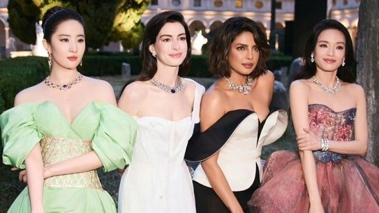 Once again at the Bvlgari event in Rome, Priyanka Chopra has once again proved that her style quotient is unmatched. Her elegant and luxurious fashion took away everyone’s attention as she walked in with her off-shoulder cream and black dress. The actress supported a short hairstyle with decent makeup. For her jewelry, she wore a Serpenti Aeterna necklace. And she looked truly amazing. All those who were present include Anne Hathaway, Liu Yifei, and Shu Qi, all of whom are global ambassadors for Bvlgari. The actress was seen in one frame with all of them. Talking about Anne Hathaway she looked stunning in a thigh-high slit white outfit. Whereas, Shu Qi wore a blue and red outfit. And how can we forget Liu Yifei? She opted for a green and golden dress at the event.