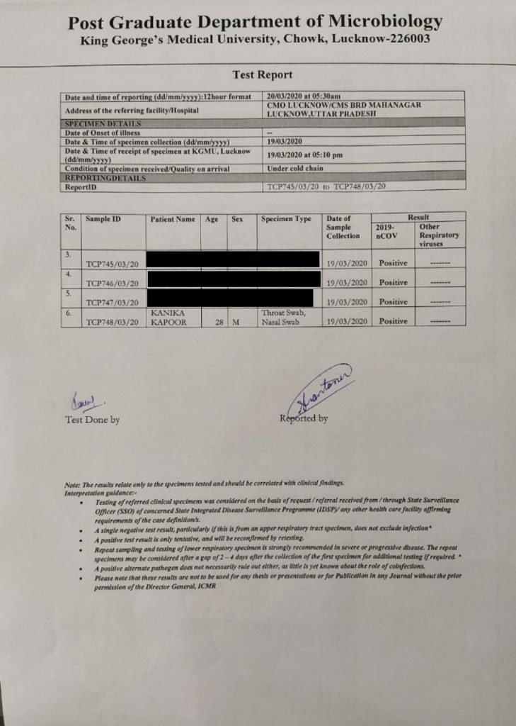 The report is from Post Graduate Department of Microbiology, King George’s Medical University in Lucknow. It clearly shows the name of Kanika Kapoor. Although the question is why her report came late. She returned to India on March 9. So why did it take 10 days for her sample to reach the lab?