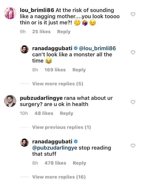 Now the actor has finally spoken on the matter. To an Insta user who wrote to him that he was worried after reading reports of his health problems, Rana wrote, ‘Stop reading that stuff.’ To another who said he lost so much of weight, Rana hilariously replied that he can’t possibly look like a monster all the time.