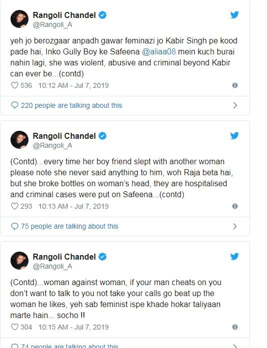 Home»Trending»Rangoli Chandel Says ‘Alia Bhatt’s Role in Gully Boy Was More Violent Than Kabir Singh’