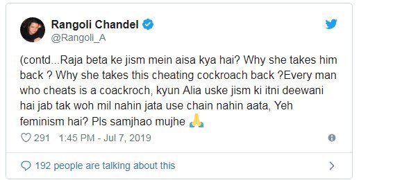 Rangoli Chandel, the elder sister of Kangana Ranaut is famous for her sparking tweets. Her tweets always become controversial stories. This time Rangoli Chandel defends Shahid Kapoor and Kiara Advani starrer Kabir Singh. Rangoli called Alia Bhatt’s character in Gully Boy more violent than Kabir Singh. Rangoli made many tweets against the role of Alia in the film Gully Boy and targeted feminists.