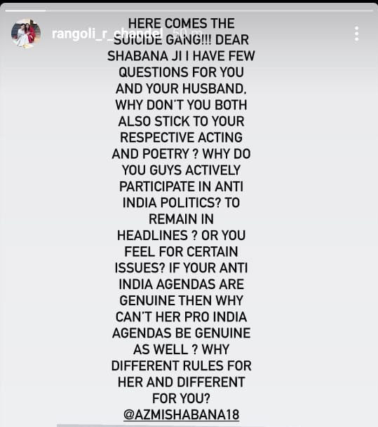Now reacting to Shabana Azmi’s comment, Kangana’s sister Rangoli Chandel targeted Shabana. Have a look: