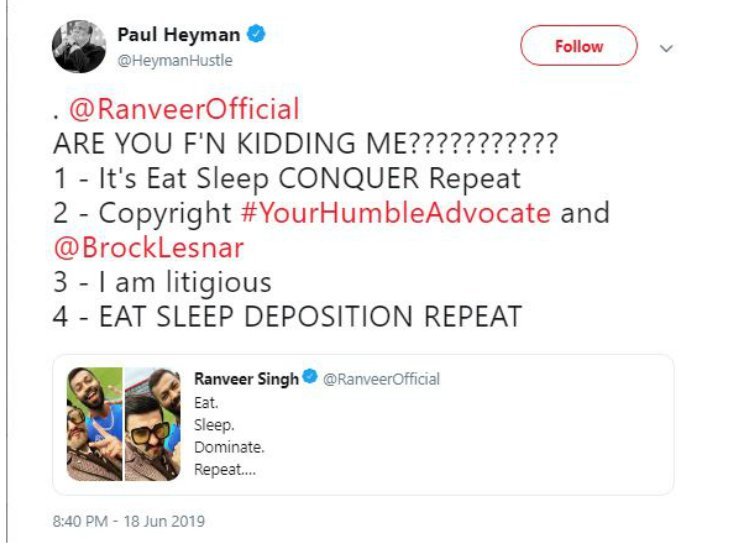 Yes, Ranveer Singh was taken by surprise on Wednesday when World Wrestling Entertainment (WWE) wrestler Brock Lesnar’s manager and advocate Paul Heyman warned him for using his phrase that was made popular by the latter inside the WWE arena. Heyman took to social media to post a litigation warning for Singh for using their ‘Eat, Sleep, Conquer, Repeat’ war cry with a twist. Watch the tweet below: