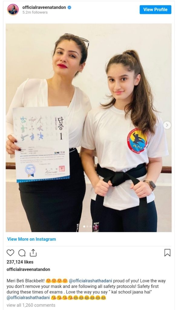 Raveena recently posted a post on her Instagram. . She has shared a photo and a video with her daughter Rasha Thadani. Raveena’s daughter Rasha has won a black belt in Taekwondo. Raveena has shared these photos to express her happiness. “My daughter, black belt. I’m so proud of you.” Giving this caption, Raveena has congratulated Rasha.