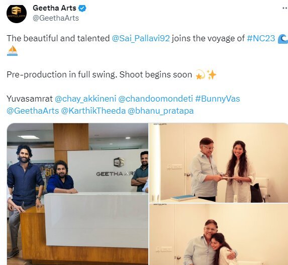 “The beautiful and talented @Sai_Pallavi92 joins the voyage of #NC23. Pre-production in full swing. Shoot begins soon. Yuvasamrat @chay_akkineni @chandoomondeti #BunnyVas @GeethaArts @KarthikTheeda @bhanu_pratapa.”