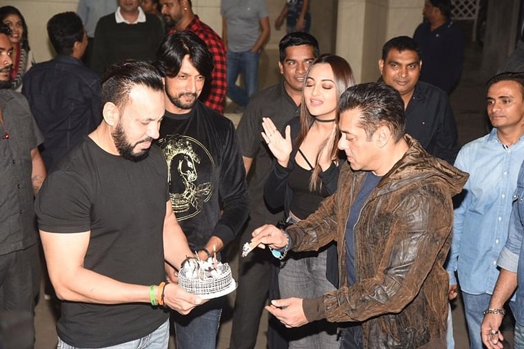 Salman Khan cut the cake on his birthday In presence of media and Dabang 3 team. Clad in tee and a leather jacket over it and denim, Salman made a stylish appearance.