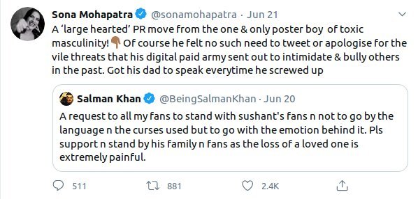 Now giving her opinion, singer Sona Mahapatra has dragged Salman Khan down by tweeting against him. She has written that “A ‘large-hearted’ PR move from the one & only poster boy of toxic masculinity! Of course, he felt no such need to tweet or apologise for the vile threats that his digital paid army sent out to intimidate & bully others in the past. Got his dad to speak every time he screwed up.”