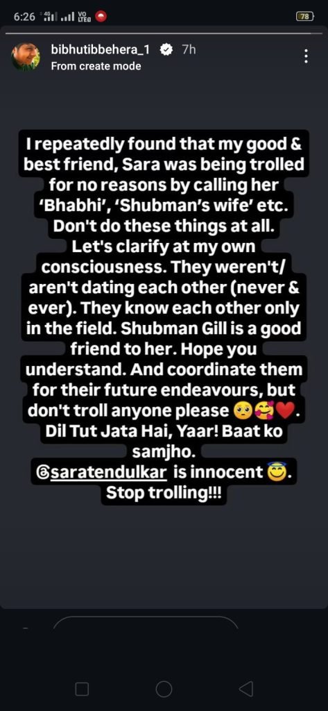 “I repeatedly found that my good & best friend, Sara was being trolled for no reasons by calling her ‘Bhabhi’, ‘Shubman’s wife’ etc. Don’t do these things at all. Let’s clarify at my own consciousness. They weren’t/ aren’t dating each other (never & ever). They know each other only in the field. Shubman Gill is a good friend to her. Hope you understand. And coordinate them for their future endeavours, but don’t troll anyone please. Dil Tut Jata Hai, Yaar! Baat ko samjho. Sara Tendulkar is innocent. Stop trolling!!!”