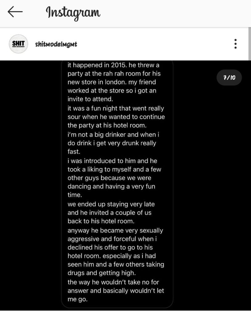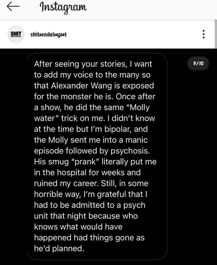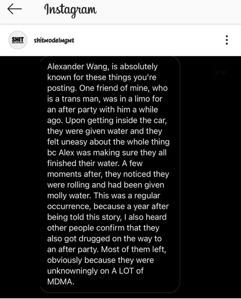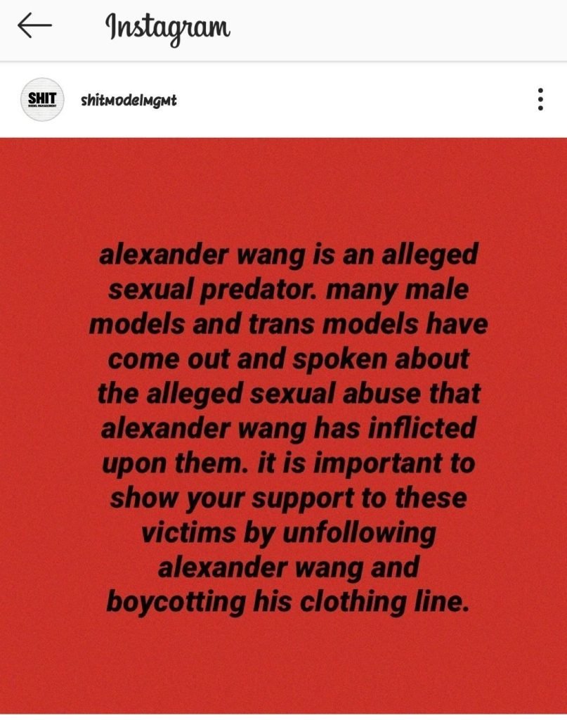 Following this publication, the Instagram account of the whistleblower, Diet Prada, as well as the account Shit Model Management, relayed other testimonies of anonymous people who have been subjected to touching, sexual abuse. Some even speak of drugs against their will and rape, naming Alexander Wang as the perpetrator. “Alexander Wang is a suspected sexual predator. Many male and transgender models reacted and spoke about the alleged sexual abuse inflicted on them by Alexander Wang. It is important to show your support for these victims by no longer following Alexander Wang and boycotting his clothing line, ”the Shit Model Management account wrote on Instagram.