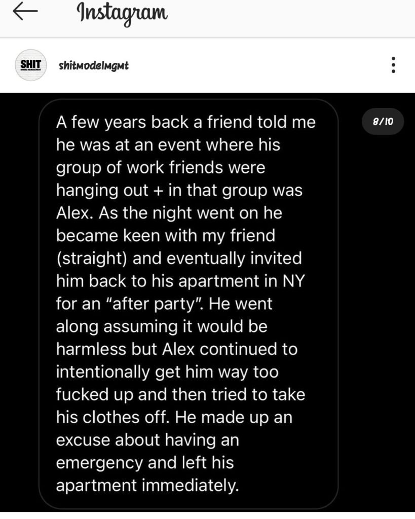 Or, “A few years ago a friend told me he was at an event where his group of work friends hung out. In this group was Alex. As the night wore on he became close with my friend (straight) and finally invited him back to his apartment in New York for an after party. He followed her assuming it would be safe, but Alex then tried to undress. He made up an excuse to have an emergency and immediately left his apartment. “