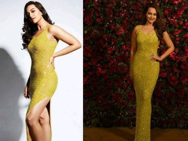 Talking about Sonakshi Sinha’s bodycon gown, she is wearing a yellow deep neck sequins gown. Her look is very glamorous.