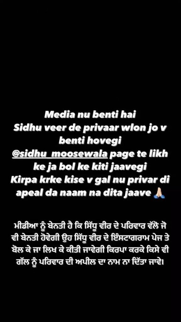 “Media nu benti hai Sidhu veer de parivaar valon jo vo benti hovegi @sidhu_moosewala page te likh ke ja bol ke kiti jayegi Kirpa krke kise v gal nu parivar di apeal da naam na dita jaave” (It is a request to the media that whatever appeal Sidhu’s family will have, it will be said or writing on @sidhu_moosewala page. Please don’t associate anything apart from that with his family’s appeal), read the statement shared on Sidhu’s official Instagram account.