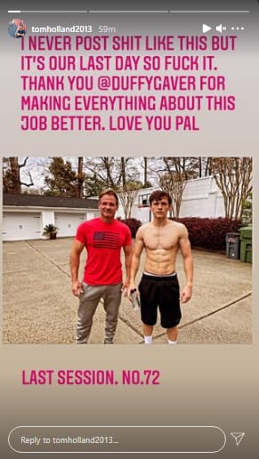 Sharing the image he wrote “I never post s–t like this but it’s our last day so f–k it,” he wrote alongside a photo of himself shirtless with his trainer. “Thank you @duffygaver for making everything about this job better. Love you pal.”