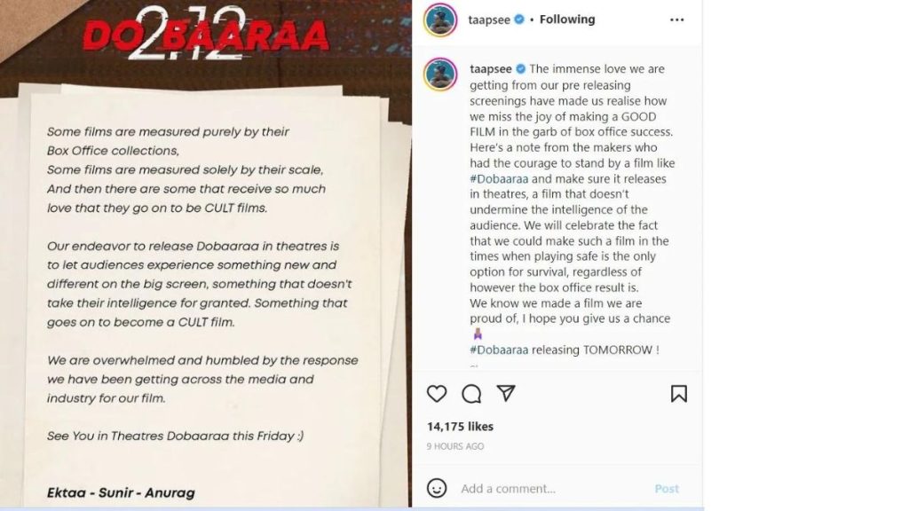 Taapsee penned alongside the note, “The immense love we are getting from our pre releasing screenings have made us realise how we miss the joy of making a good film in the garb of box office success. Here’s a note from the makers who had the courage to stand by a film like #Dobaaraa and make sure it releases in theatres, a film that doesn’t undermine the intelligence of the audience. We will celebrate the fact that we could make such a film in the times when playing safe is the only option for survival, regardless of however the box office result is. We know we made a film we are proud of, I hope you give us a chance.”