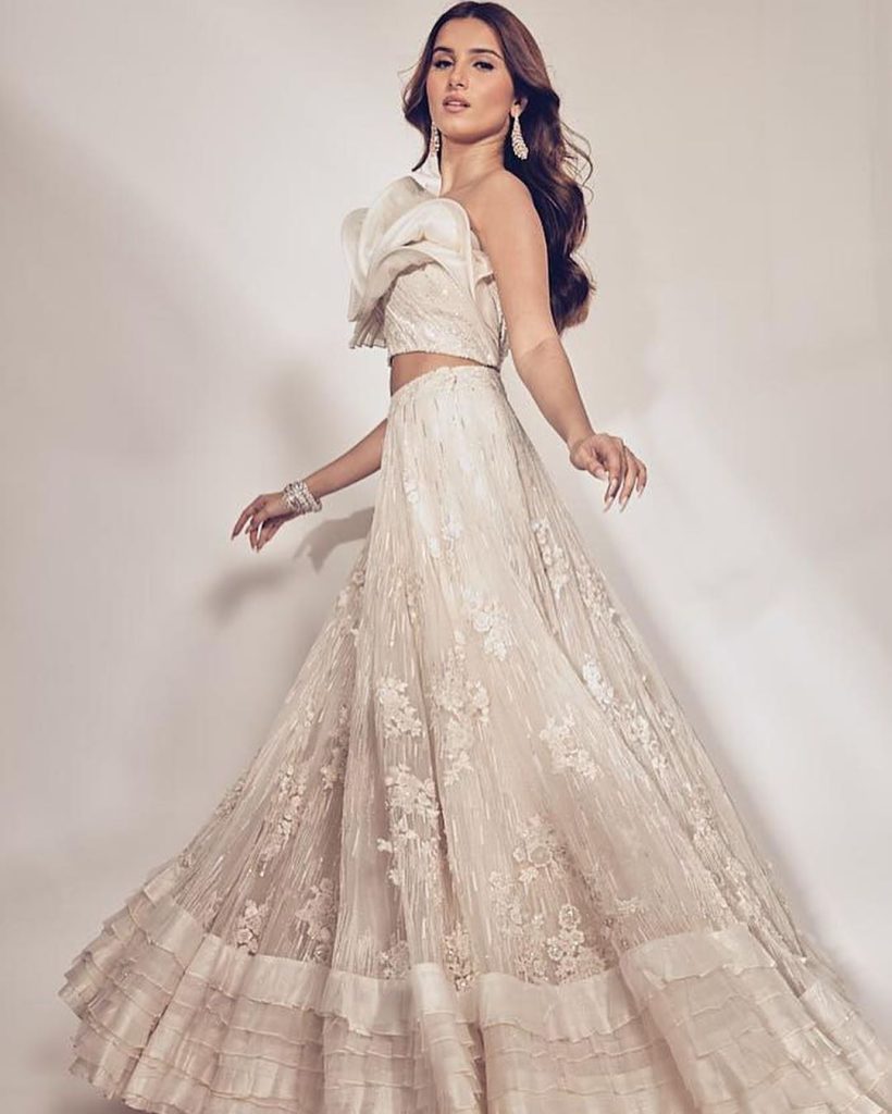 As she walked the ramp in an off-shoulder beautiful white gown she looked amazing. She left her tresses open. In addition, she carried a pair of high heels. At this fashion week, she walked the ramp for fashion designer Sulakshana Monga.