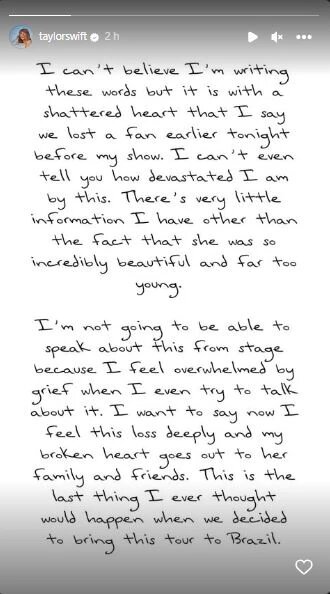 Just before her most recent engagement in Brazil, Taylor Swift received word of a fan’s death and conveyed her deep sorrow. The singer sent a touching message on her Instagram Stories, expressing her deep sadness at the tragic news.