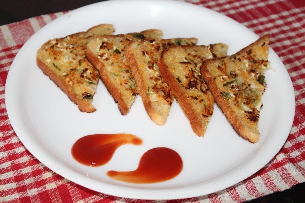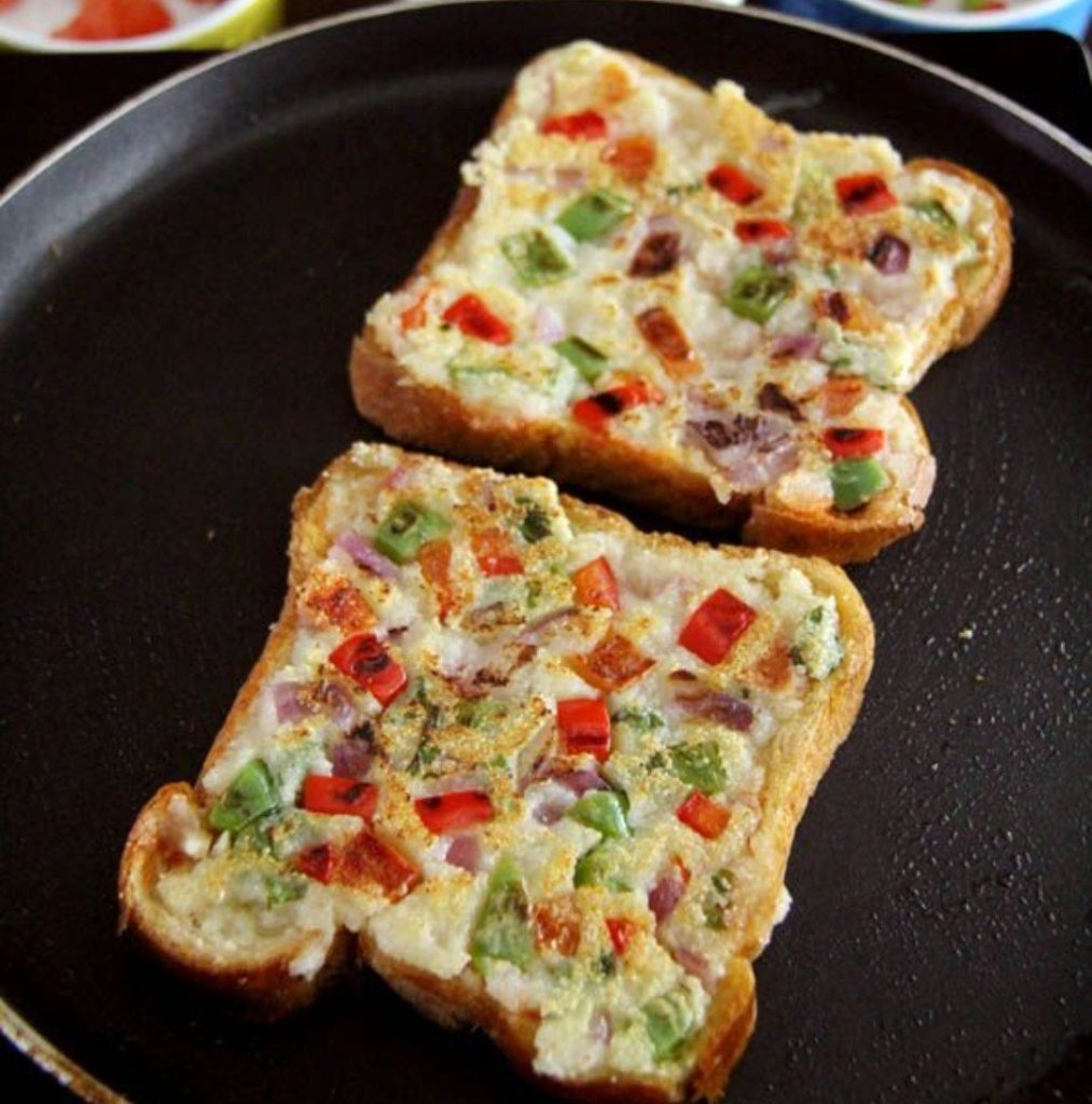 It is something which is really tasty and takes a few minutes to be cooked. Just grab some sooji in a bowl. Add chopped onions and tomatoes. Add coriander if you want. Add salt and your favorite spices. Add water to make a thick batter. Spread batter on one side of the bread and put it over nonstick tawa or pan. Spread the batter on the other side also. Once it is roasted, cut into slices and have it!