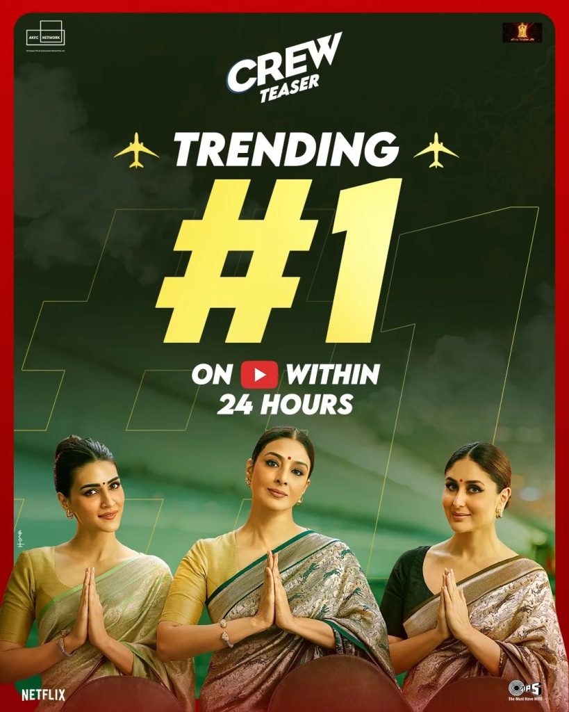 The ‘Crew’ teaser hitting the top spot on YouTube shows the curiosity of the people. And the way they are looking forward to it. With its infectious charm and dynamic performances. The netizens can’t wait to see the full movie in theaters. Everyone’s talking about how fun and cool the teaser is, with its humor, funny moments, and awesome music. The film looks promising with a