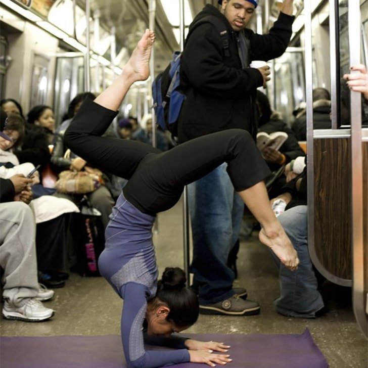 This girl is seen performing Yoga in the train feels as if she runs a yoga studio and was using this public display to drum up her business, she definitely caught the attention of the man standing next to her.
