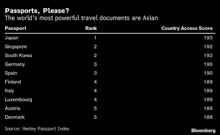As per Henley Passport Index from Henley & Partners, an immigration consultancy. A Japanese passport ranks first in the list, as it provides, hassle-free entry to 193 countries, whereas, Singapore and South Korea are in second place, according to the latest Index. Other countries that top the list are The UK which stands sixth with access to 187 countries, while the US is seventh with a score of 186.
