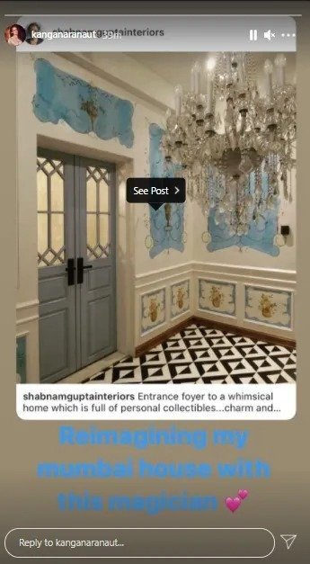 Kangana Ranaut is known as one of the bold film actresses in the Bollywood industry. And it feels like she is in high spirits now. As she arrived this Sunday in Mumbai. The actress visited the city when BMC demolished her Mumbai house, but it looks like she is beginning the reconstruction. Which is good news for all the well-wishers of Kangana and her family. As per the news reports this time she is imagining her Mumbai home with interior designer Shabnam Gupta. Talking about the same Subnam took to her Instagram to post the picture of the production home Kangana is imagining about. Posting a beautiful picture of her house entrance painted in blue and white, she wrote “Entrance foyer to a whimsical home which is full of personal collectibles…charm and uninhibited statements.”