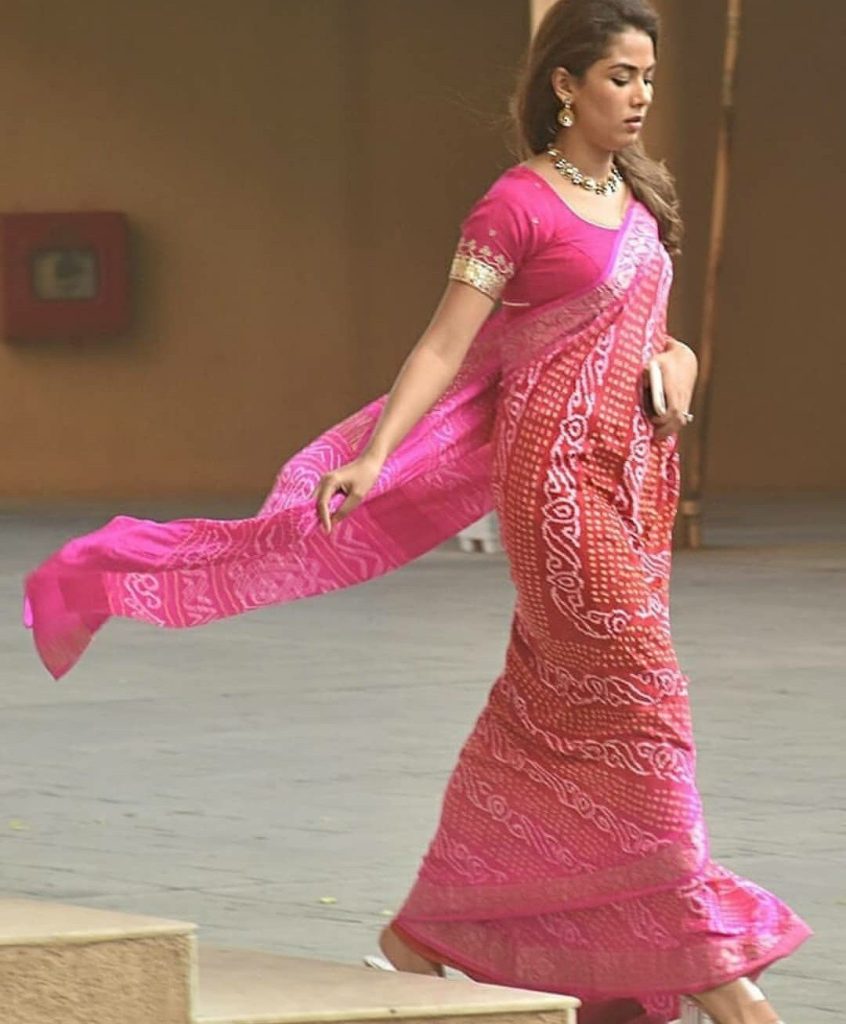 She was spotted in pink saree like a ‘Jhonka Hawa Ka’! Her saree was teamed up with beautiful jwellery giving her a light but pretty look!